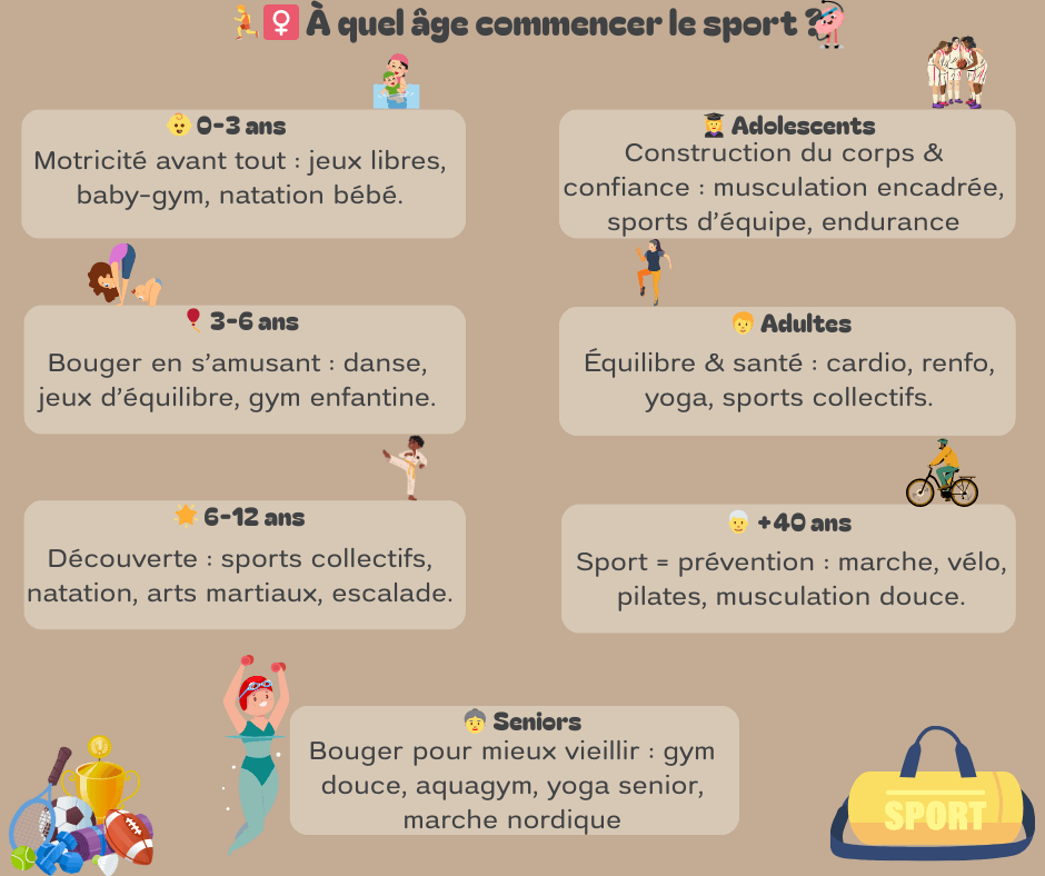 Conseils pratiques : que vous vous demandiez à quel âge commencer le sport ou que vous repreniez après une pause, privilégiez une reprise progressive, à raison de 2 à 3 séances par semaine au départ, en choisissant une activité adaptée à votre condition physique. Une visite médicale est recommandée avant de démarrer, notamment en cas de pathologies chroniques ou de surpoids.