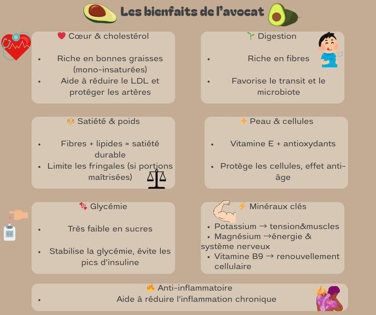 👉 Cette richesse explique pourquoi les bienfaits de l’avocat vont bien au-delà de son image “healthy”, à condition de l’intégrer avec mesure dans une alimentation équilibrée.