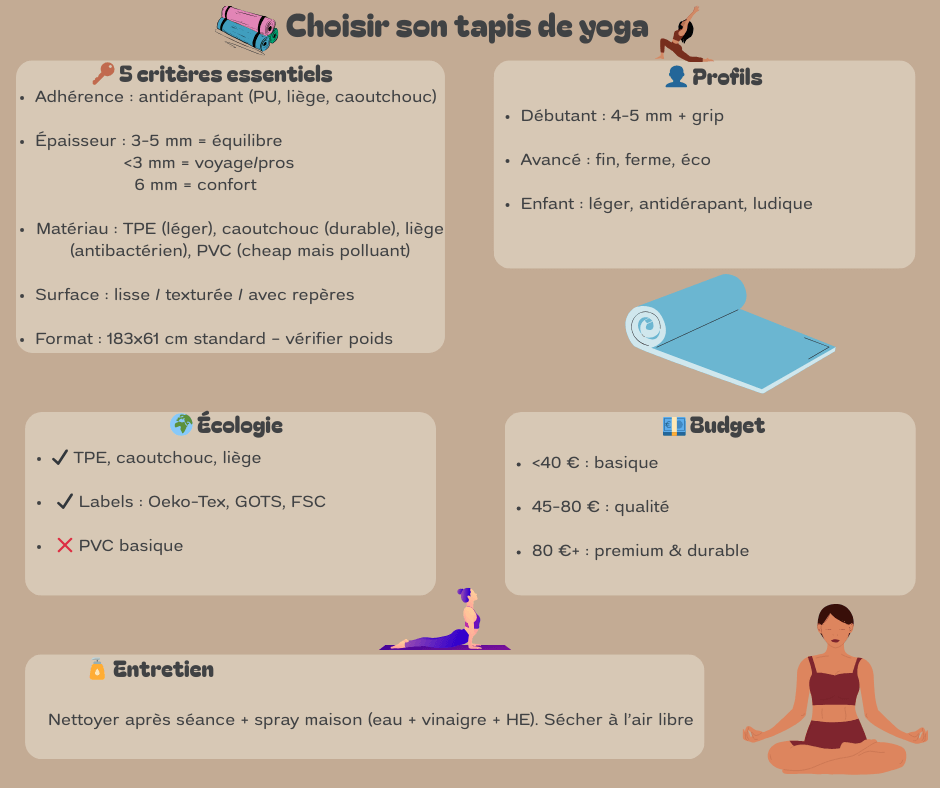 - TPE : Léger, antidérapant, recyclable. Idéal pour débutants.