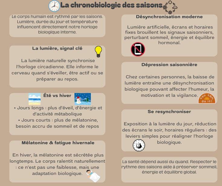 La chronobiologie et la saisonnalité étudient l’influence des saisons sur nos rythmes biologiques. La variation de lumière, de température et de durée du jour modifie l’horloge biologique, la sécrétion hormonale, le sommeil et l’énergie.