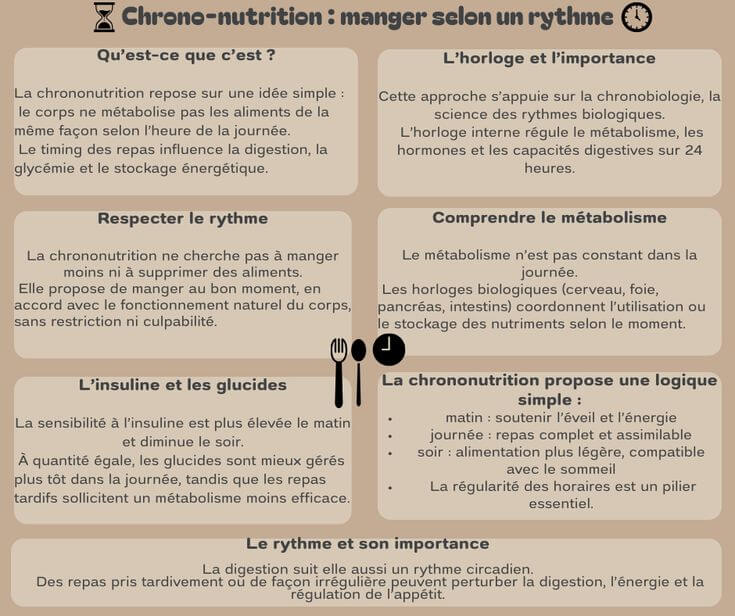 En lien direct avec la chronobiologie, la chrononutrition s’intéresse au moment des repas autant qu’à leur composition. Elle prend en compte le fonctionnement du métabolisme, la sécrétion hormonale, notamment l’insuline, et les capacités digestives variables au fil de la journée.