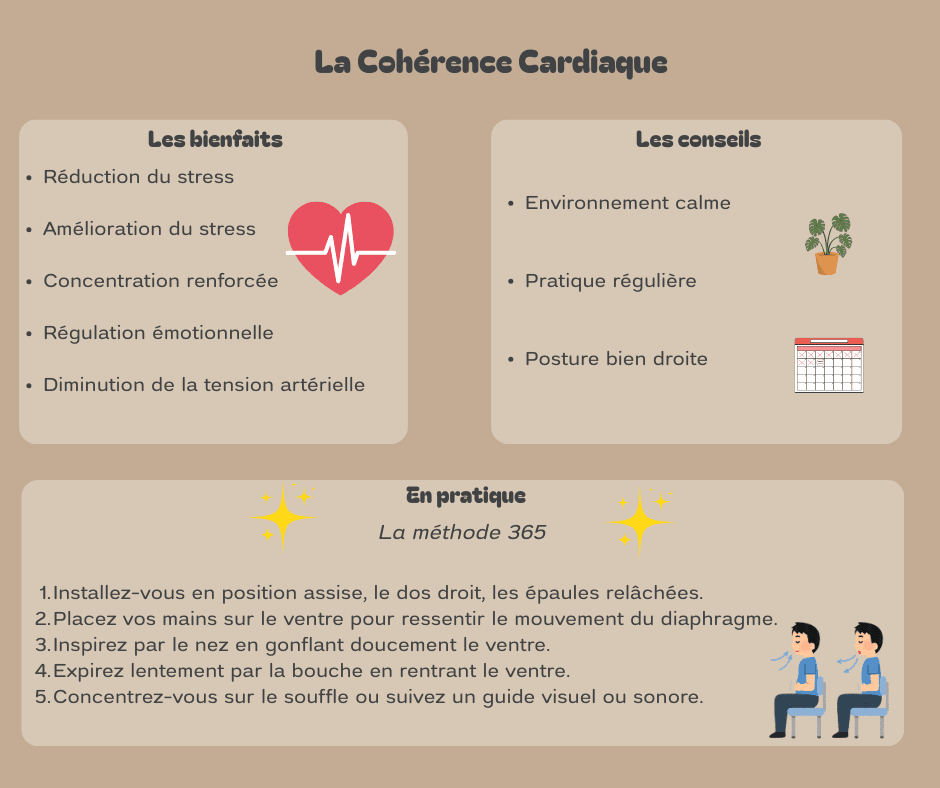 La cohérence cardiaque est une pratique de respiration rythmée, lente et consciente (inspirer par le nez, expirer par la bouche) qui vise à synchroniser le rythme respiratoire avec les battements du cœur. Elle régule la variabilité cardiaque pour équilibrer les systèmes nerveux sympathique (vigilance) et parasympathique (repos), induisant ainsi le calme et l’équilibre émotionnel.