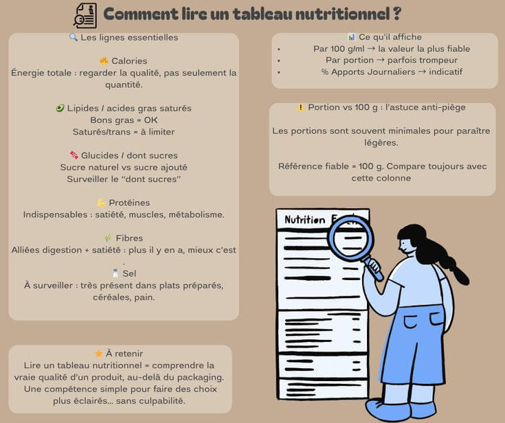 Si tu veux vraiment comprendre comment lire un tableau nutritionnel, imagine que tu analyses la “carte d’identité énergétique” d’un aliment. Chaque ligne est un indice, comme dans une enquête de détective du quotidien. L’objectif n’est pas de sortir la loupe à chaque repas, mais de savoir repérer les signaux essentiels.