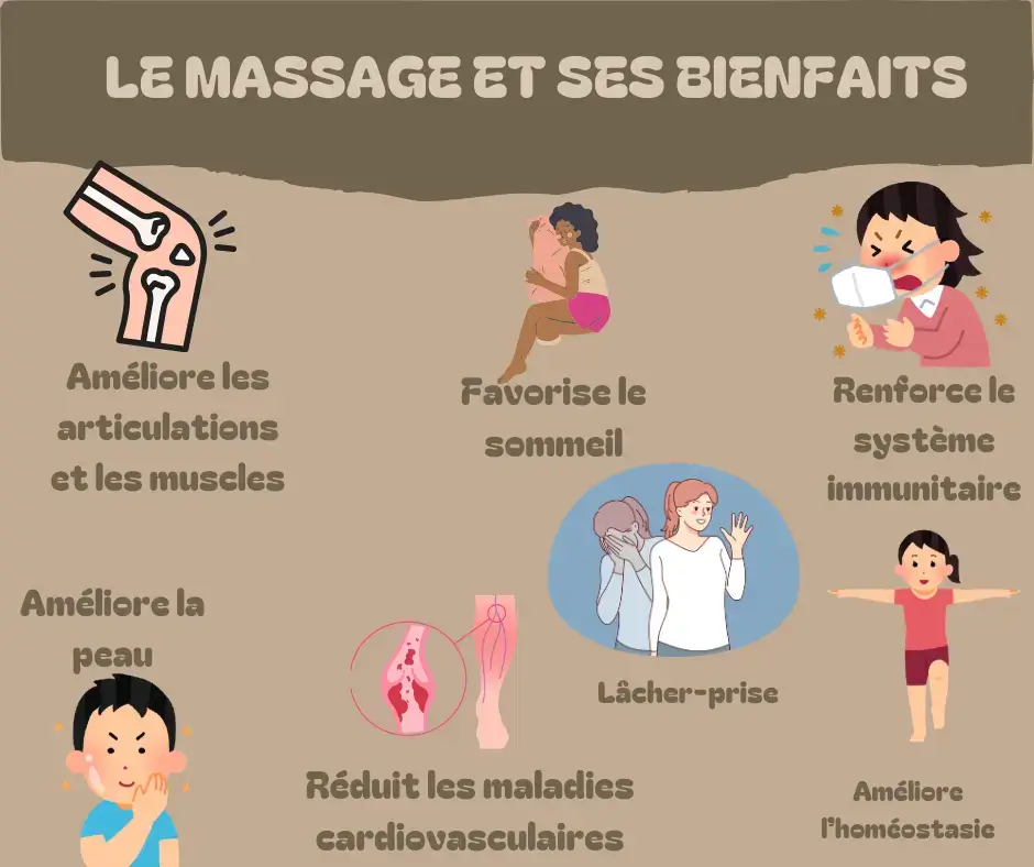 Les bienfaits du massage sont à la fois physiques et mentaux. Il aide à réguler l’équilibre interne du corps (homéostasie), réduit le stress en diminuant le cortisol, soulage la tension musculaire permanente ou occasionnelle, améliore la circulation sanguine et lymphatique, renforce le système immunitaire, favorise un sommeil réparateur et aide au lâcher-prise émotionnel.