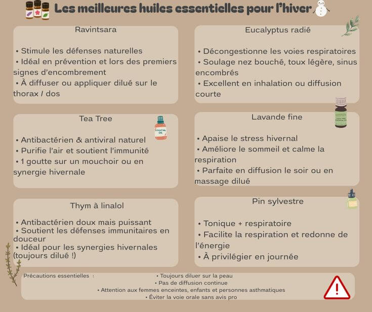 Exemples des meilleures huiles essentielles pour l’hiver qui agissent en synergie :