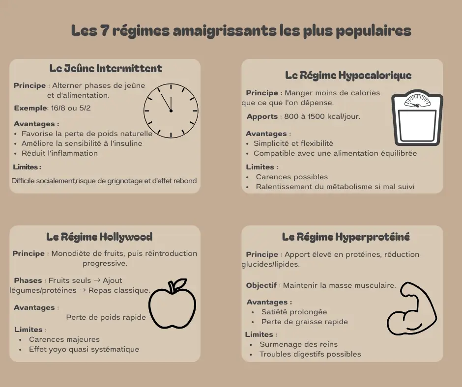TogglePerdre du poids de manière rapide, efficace et durable est un objectif partagé par de nombreuses personnes. Pour y parvenir, certains se tournent vers des régimes amaigrissants aux promesses variées. Du jeûne intermittent au régime hyperprotéiné, en passant par les régimes dissociés ou le régime Cohen, chaque méthode possède ses spécificités. Mais sont-elles toutes adaptées à un amaigrissement sain et stable ? Voici un tour d’horizon des 7 régimes pour maigrir vite les plus populaires, avec leurs avantages, leurs limites et leur faisabilité au quotidien.